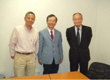 参加者:左から、会員の濱口、柏谷、黒田3氏 上部は講師の高橋会長 |